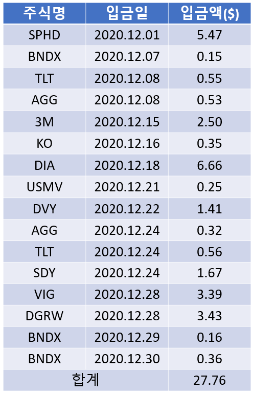 1) SPHD, DGRW, DIA로 매월 $10~15 배당으로 매월 최소 $10 배당수익